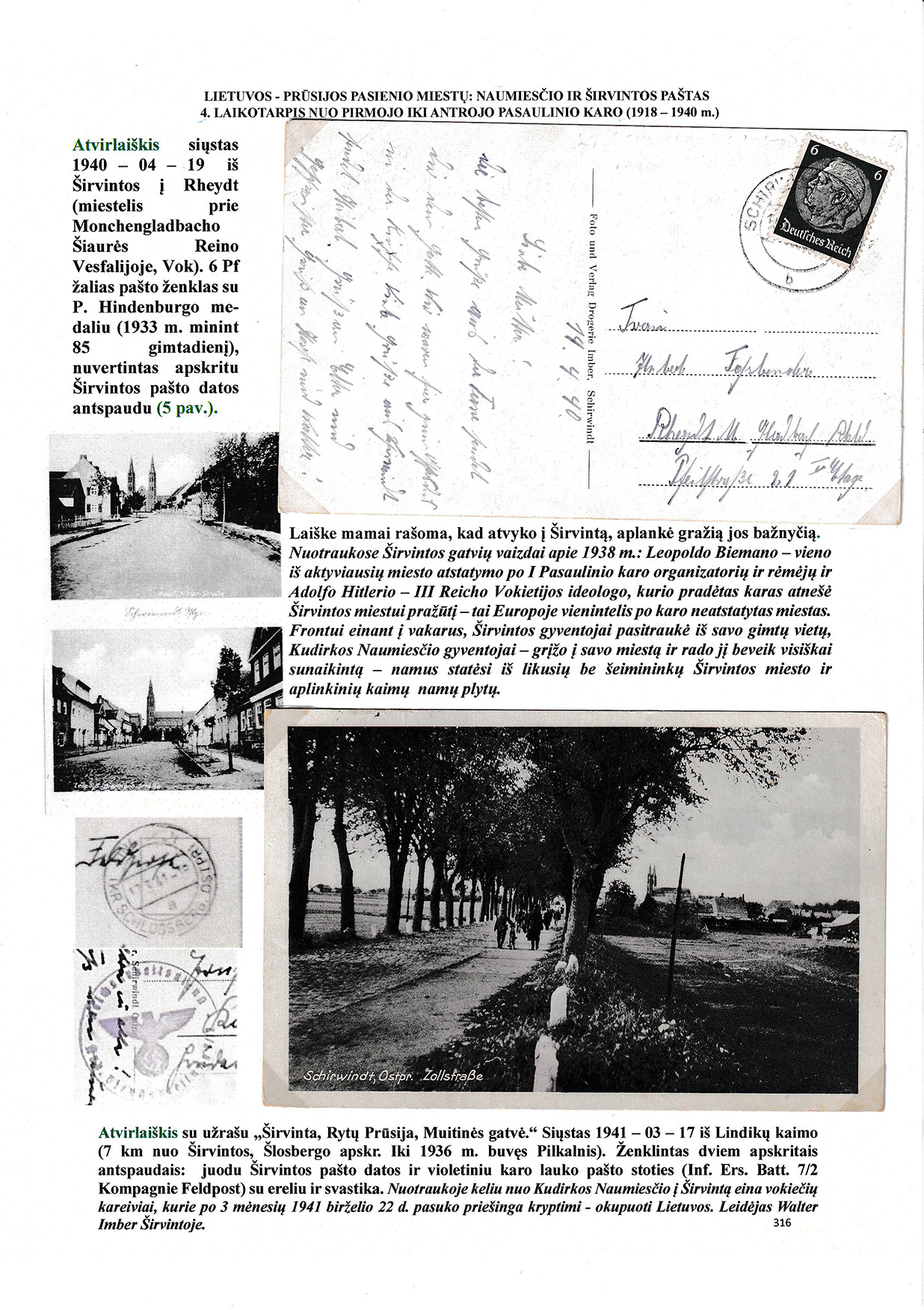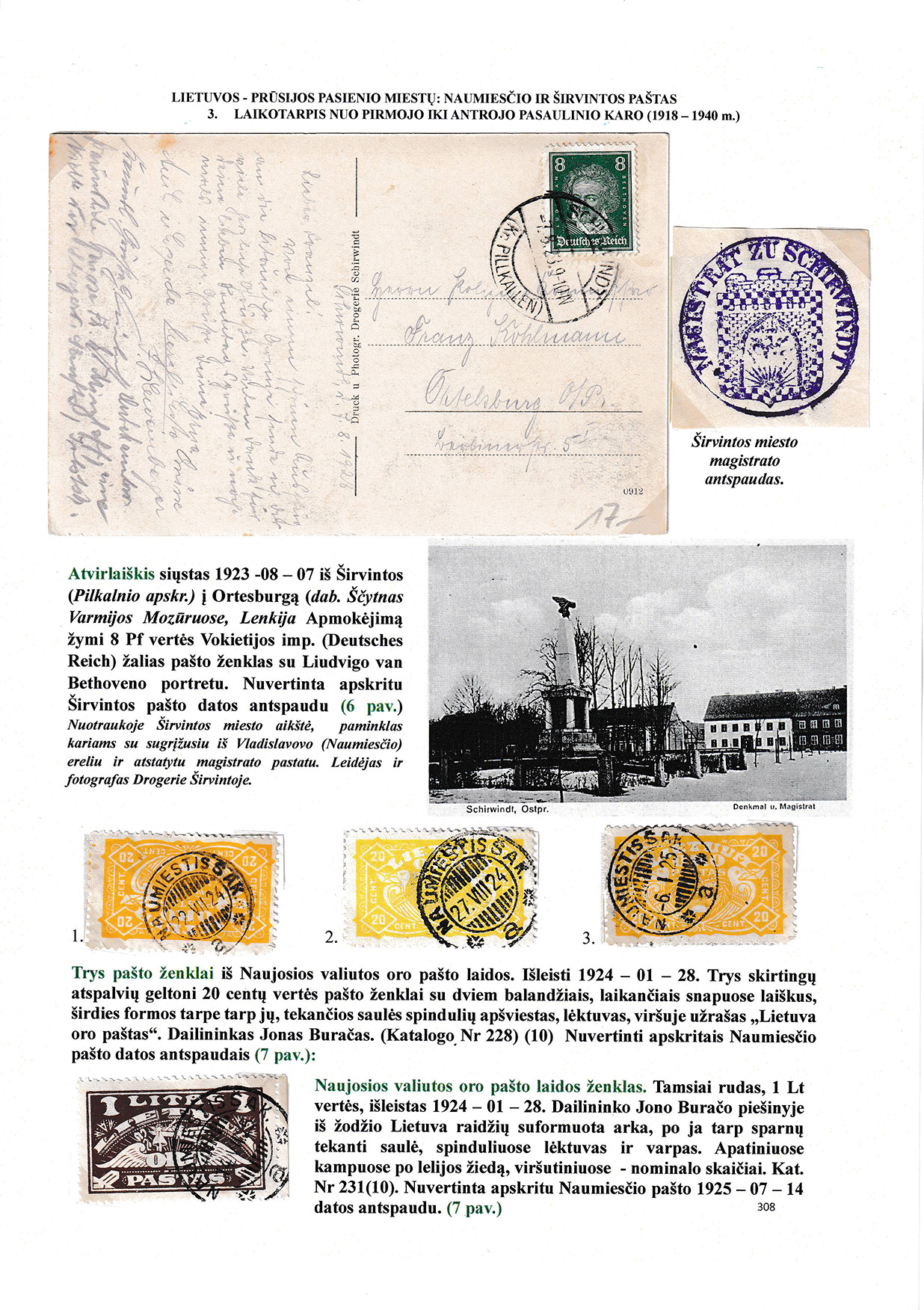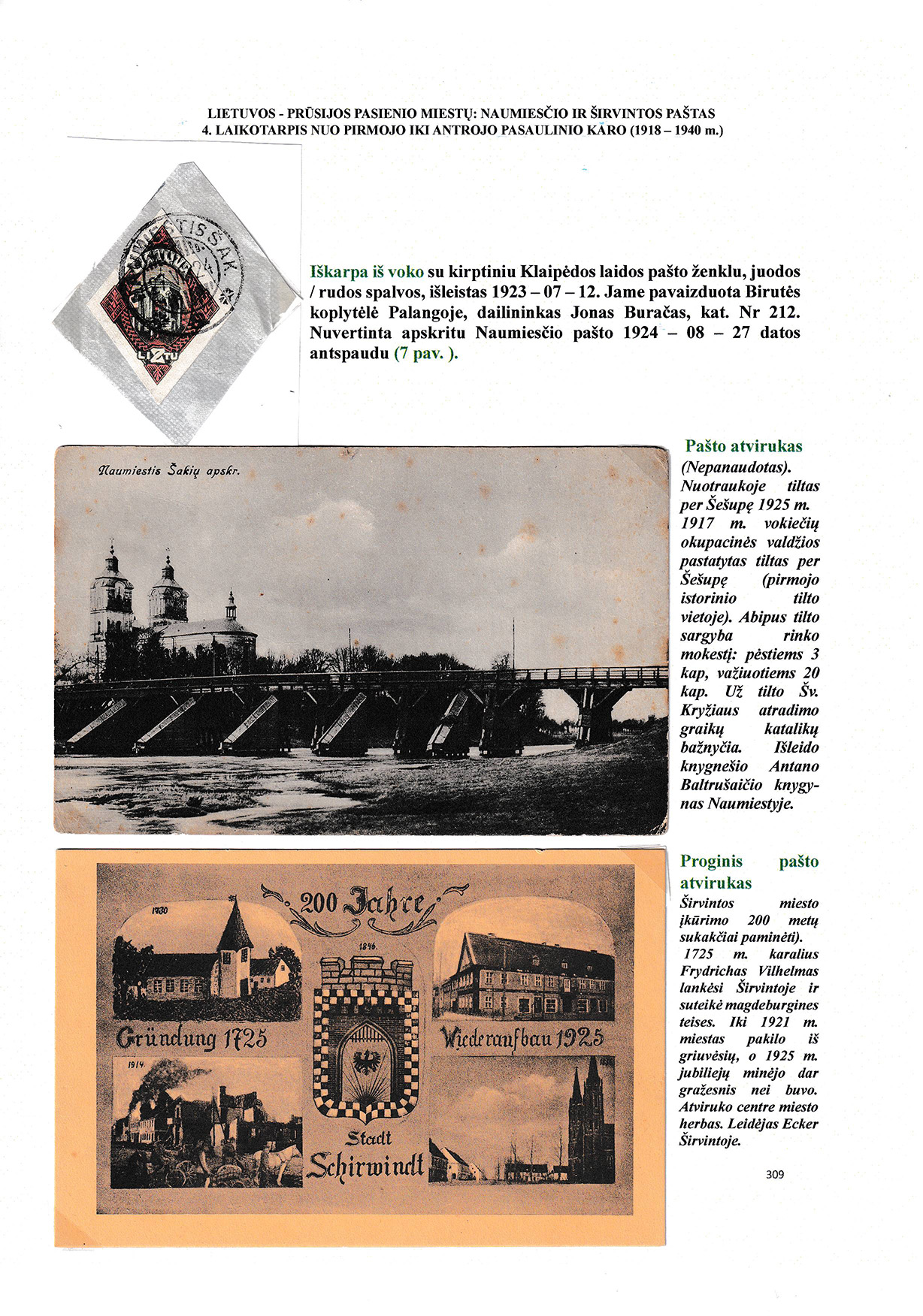 The exhibit aims to showcase the connections and differences within the postal systems of Naumiestis (Vladislavovo / Neustadt / Kudirka Naumiestis) and Širvinta, referred to as twin border towns. This three-frame exhibit presents a chronological display from 1825 to 1940 (beginning of the Second World War), divided into four periods. It explores local and cross-border events and personalities associated with these periods. The connections are rooted in geographical location, with both cities situated on both sides of the Širvinta and Šešupė rivers since 1422, marking state borders by the Treaty of Melno. Historical events, such as the establishment of the World Postal Union, changes initiated by it, the ban on printing in Latin (Polish) characters, and movements of resistance like book smuggling, war, occupations, economic crises, and the creation of the State of Lithuania, are also highlighted. Economic and social relations between residents living in different countries encompass trade, smuggling, work, official positions, earnings, and marriage. The postal service played a significant role, particularly during the German rule from 1795 to 1807, showing positive influences like the connection of towns by post roads, introduction of passports, and economic upswing. Conversely, during the First World War from 1915 to 1918, negative influences such as restrictions on civil mail, residents’ rights, property expropriation, and obligations are examined. In the interwar period until the Third Reich, the exhibit explores intensive trade, smuggling, labor relations, mutual aid, and increasingly restricted communication leading to the eventual closure of the border crossing.