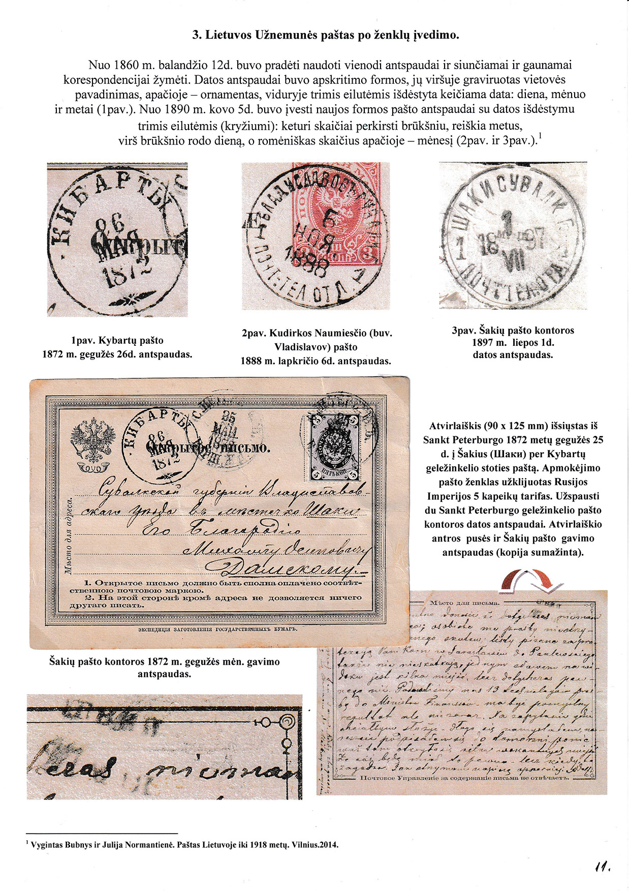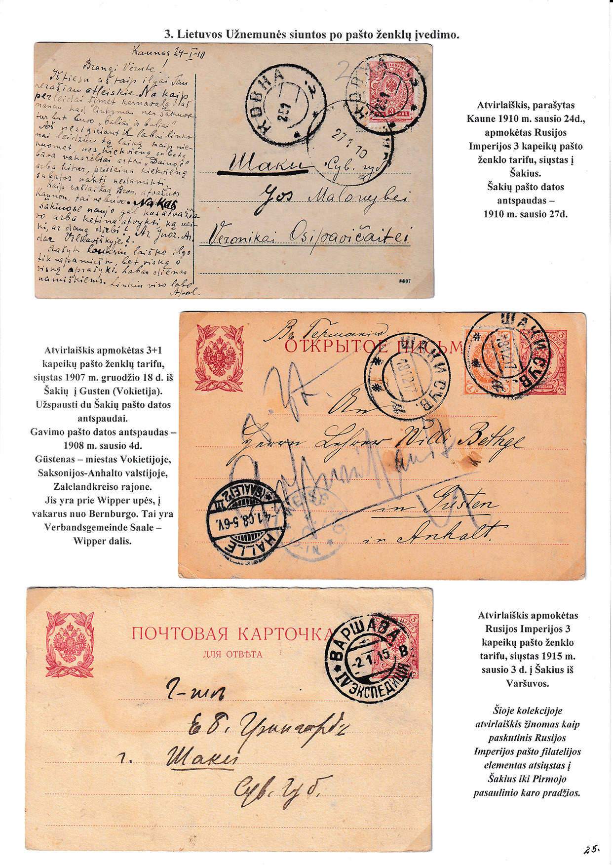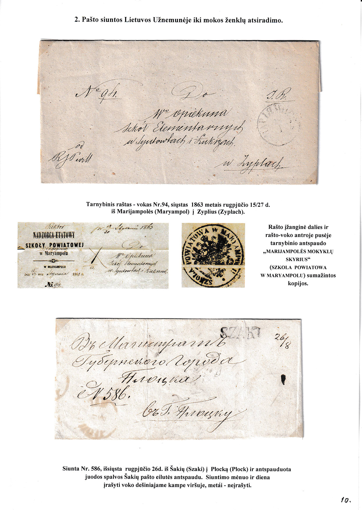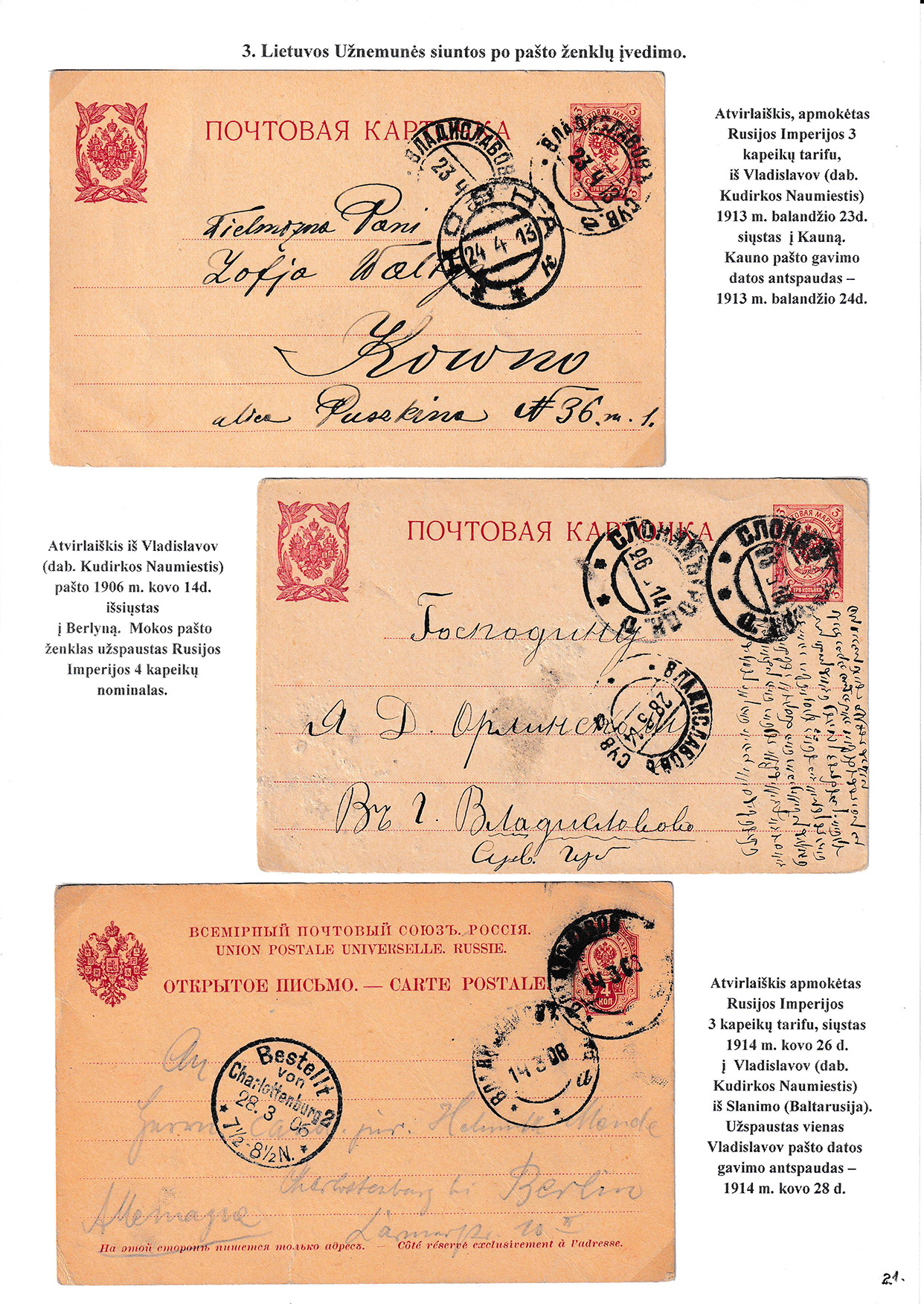 During different periods the following frontier post offices and post stations operated in the Užnemunė region in 1815-1866: Aleksotas (Alexota) from1815, Alytus (Olita) from 1841, Garliava (Godlewo) from1841, Kalvarija(Kalwarya) from 1815, Kapčiamiestis (Kopciov) from 1863, Lazdijai (Lozdzieje) from 1817, Marijampolė (Maryampol, Mariampol) from 1815, Vilkaviškis (Wilkowiszki) from 1815, Virbalis (Wierzbolow). Kudirkos Naujamiestis (Nowe Miasto, since December 11th, 1819, the name of the village is Wladyslawow) mail transportation and horse changing station since 1817. The philatelic exhibit of Užnemunė region includes postal item until 1858, postal history during the Governorate period after the introduction of postage stamps and Ober-Ost period. Also the period of the history of the Independent Lithuanian Post.