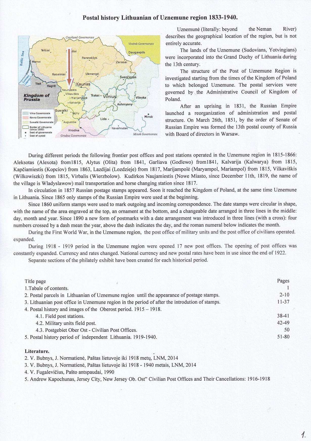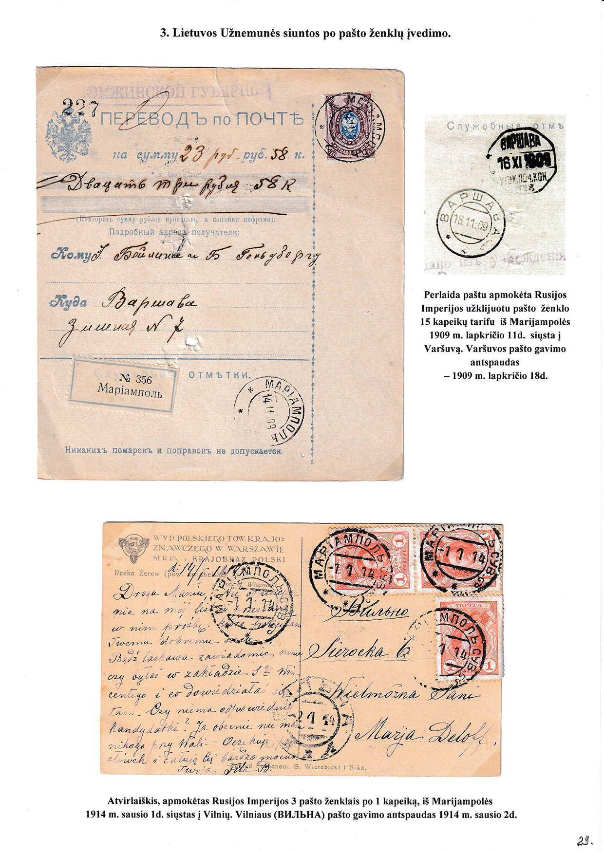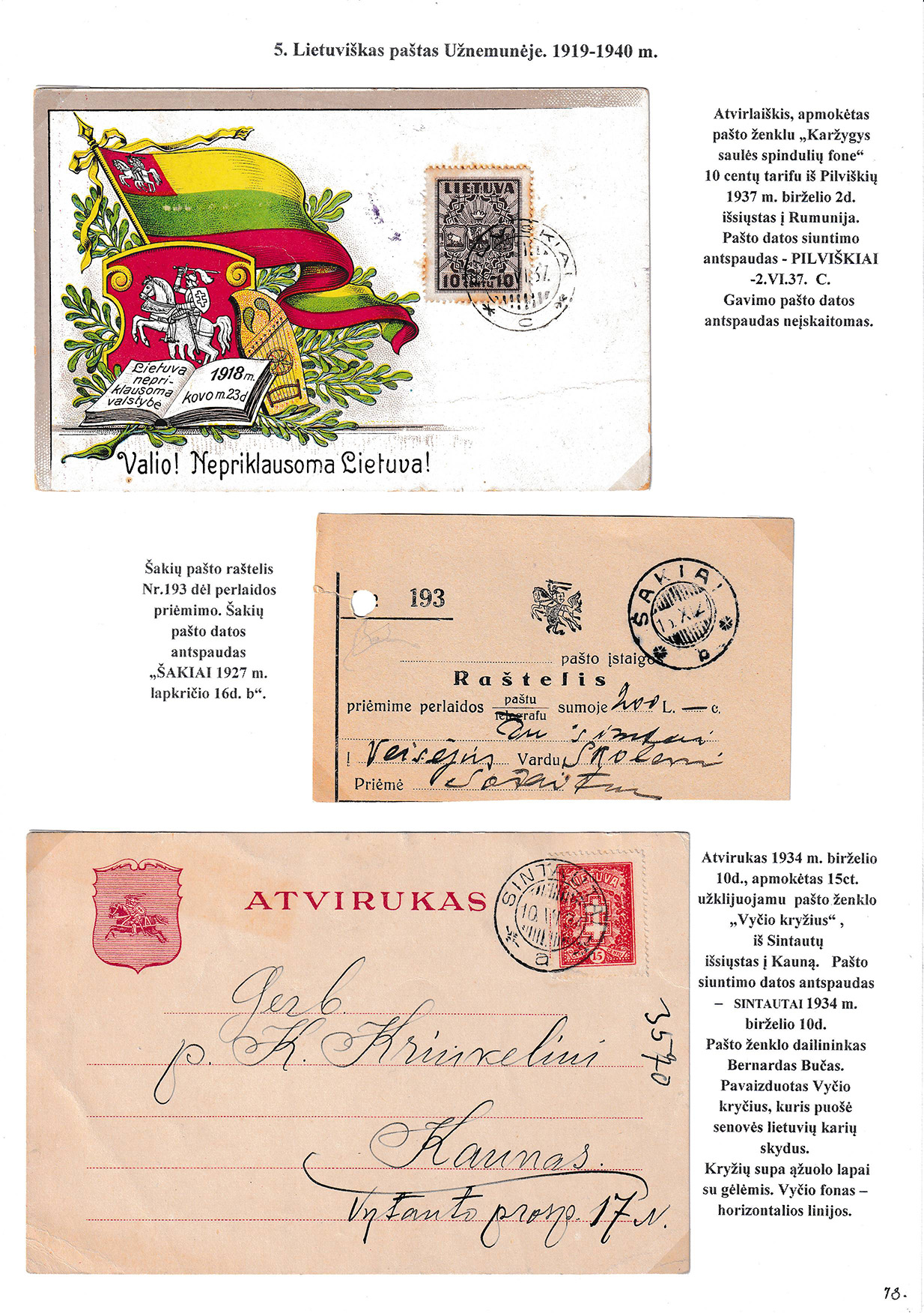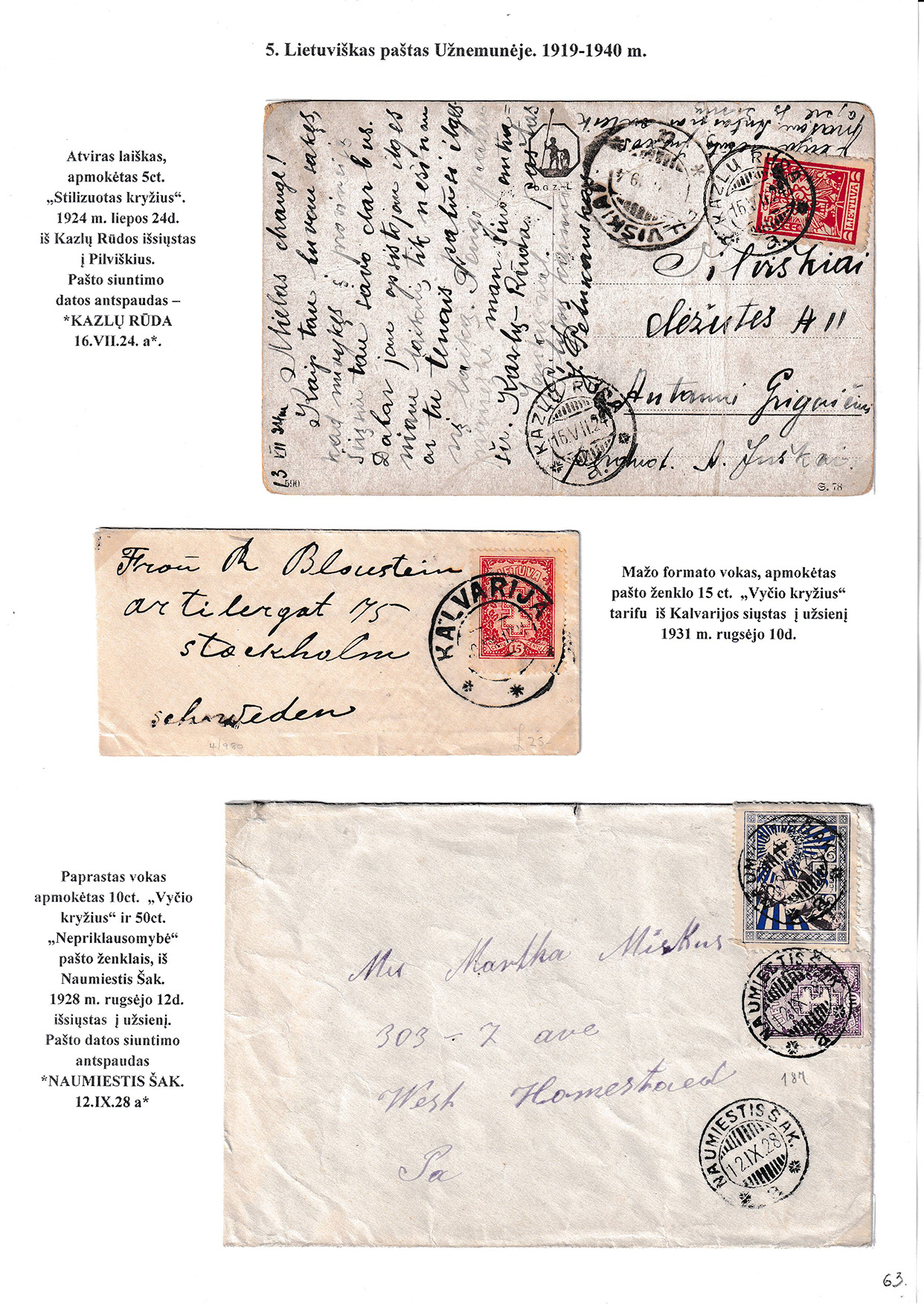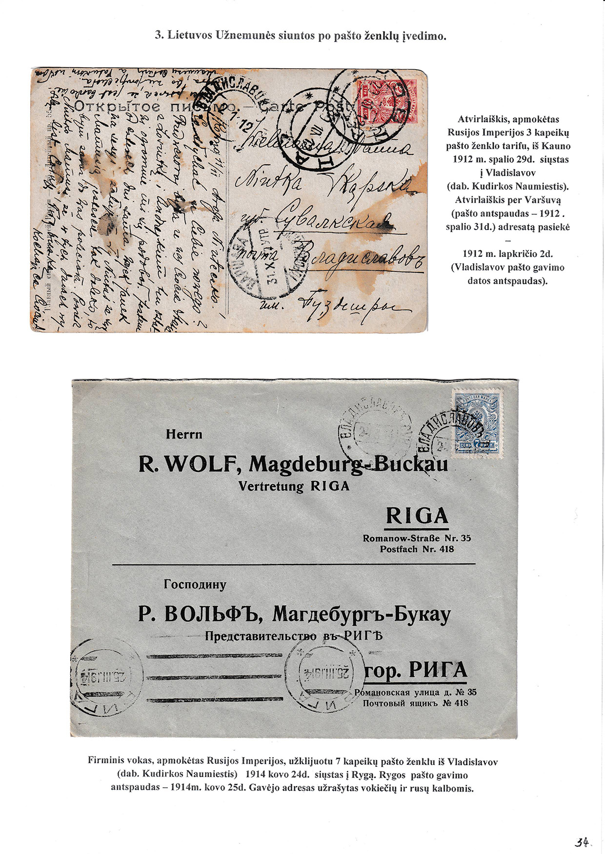 During different periods the following frontier post offices and post stations operated in the Užnemunė region in 1815-1866: Aleksotas (Alexota) from1815, Alytus (Olita) from 1841, Garliava (Godlewo) from1841, Kalvarija(Kalwarya) from 1815, Kapčiamiestis (Kopciov) from 1863, Lazdijai (Lozdzieje) from 1817, Marijampolė (Maryampol, Mariampol) from 1815, Vilkaviškis (Wilkowiszki) from 1815, Virbalis (Wierzbolow). Kudirkos Naujamiestis (Nowe Miasto, since December 11th, 1819, the name of the village is Wladyslawow) mail transportation and horse changing station since 1817. The philatelic exhibit of Užnemunė region includes postal item until 1858, postal history during the Governorate period after the introduction of postage stamps and Ober-Ost period. Also the period of the history of the Independent Lithuanian Post.