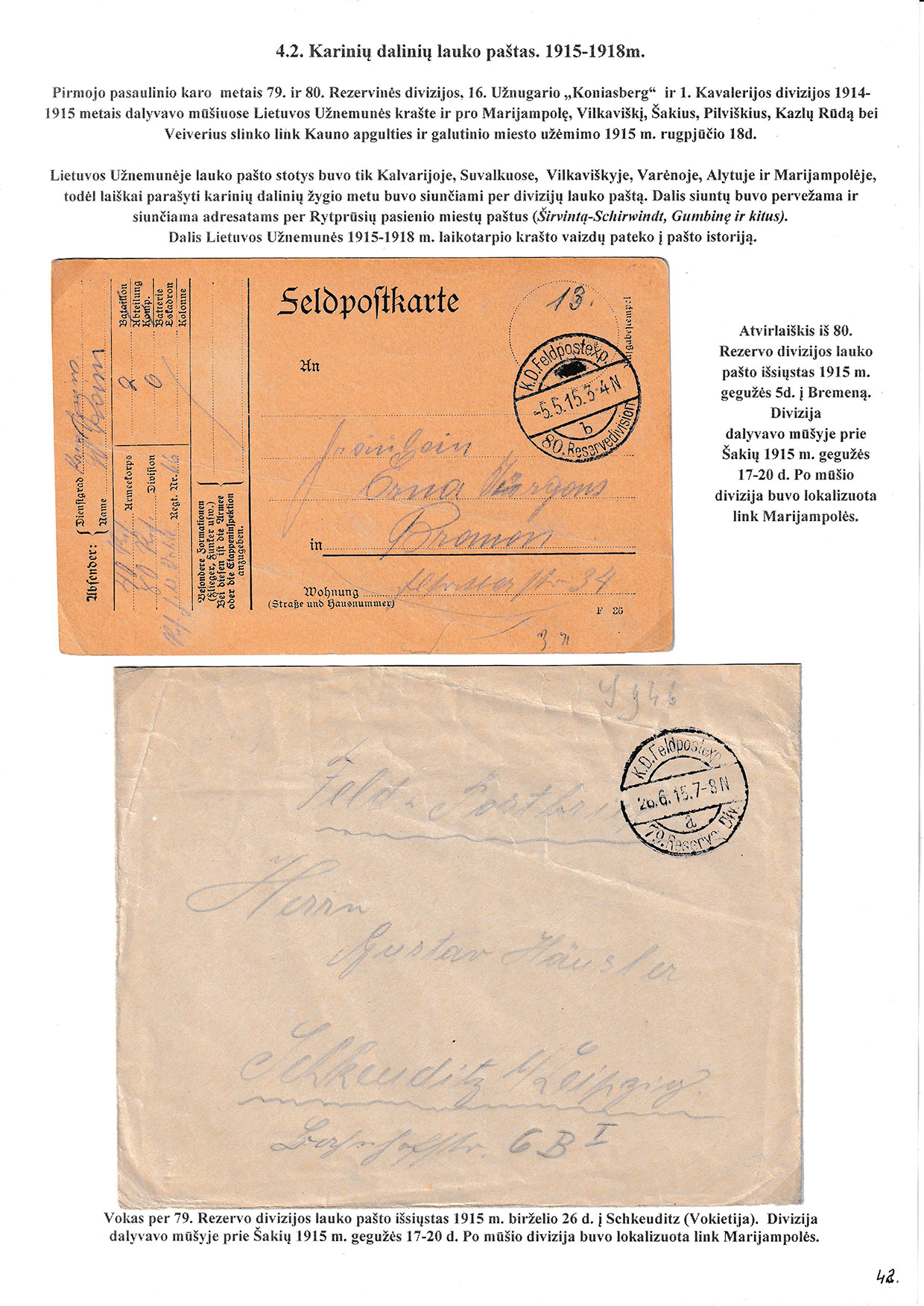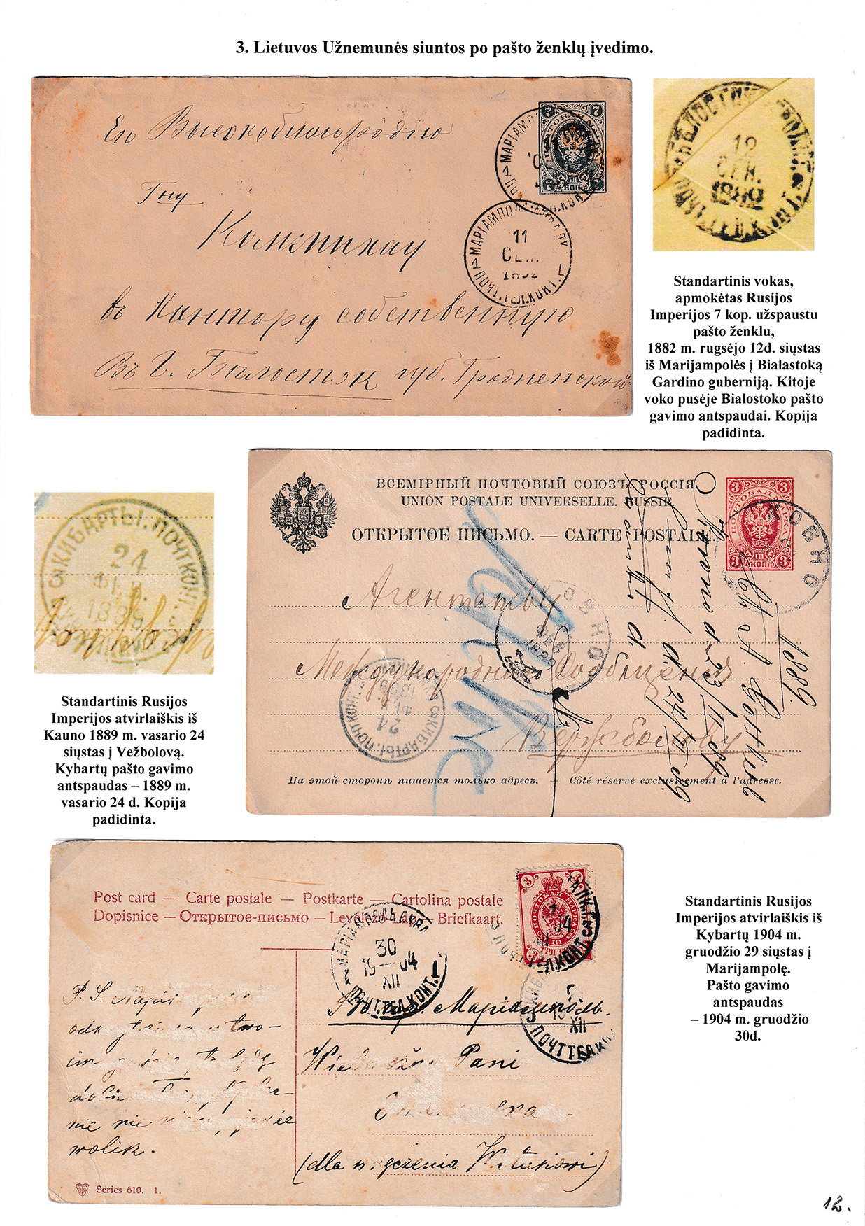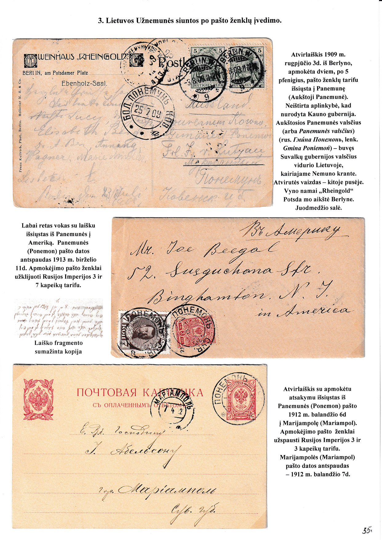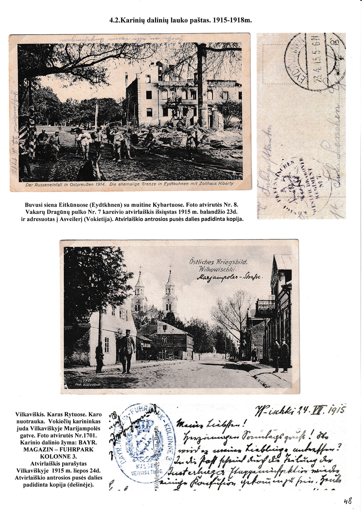 During different periods the following frontier post offices and post stations operated in the Užnemunė region in 1815-1866: Aleksotas (Alexota) from1815, Alytus (Olita) from 1841, Garliava (Godlewo) from1841, Kalvarija(Kalwarya) from 1815, Kapčiamiestis (Kopciov) from 1863, Lazdijai (Lozdzieje) from 1817, Marijampolė (Maryampol, Mariampol) from 1815, Vilkaviškis (Wilkowiszki) from 1815, Virbalis (Wierzbolow). Kudirkos Naujamiestis (Nowe Miasto, since December 11th, 1819, the name of the village is Wladyslawow) mail transportation and horse changing station since 1817. The philatelic exhibit of Užnemunė region includes postal item until 1858, postal history during the Governorate period after the introduction of postage stamps and Ober-Ost period. Also the period of the history of the Independent Lithuanian Post.