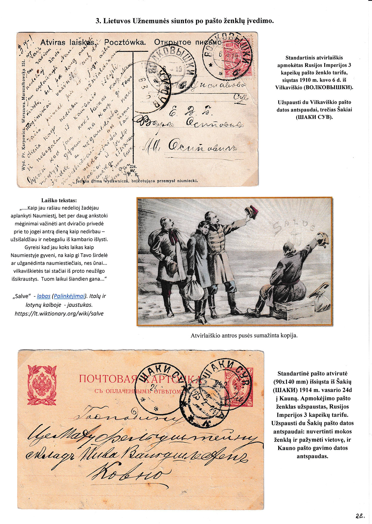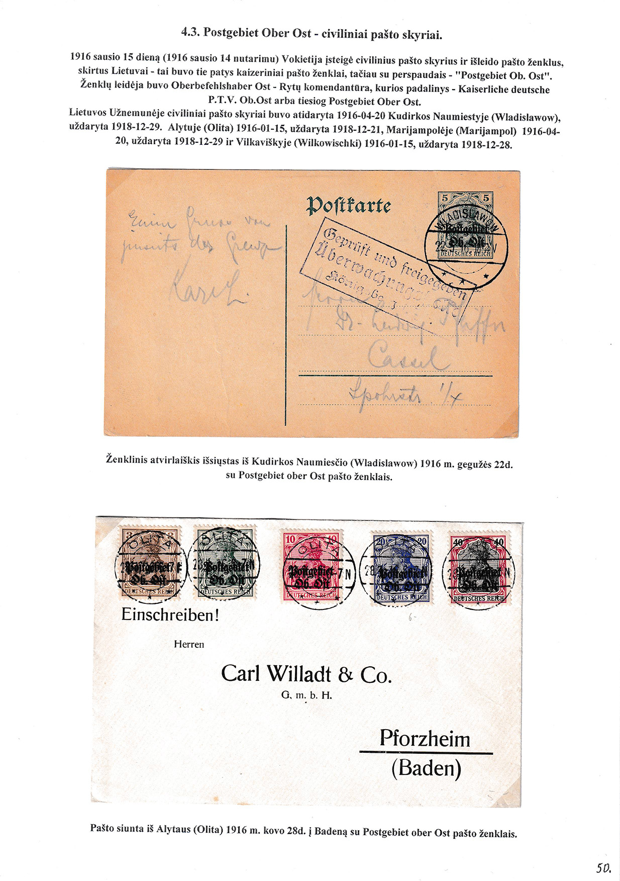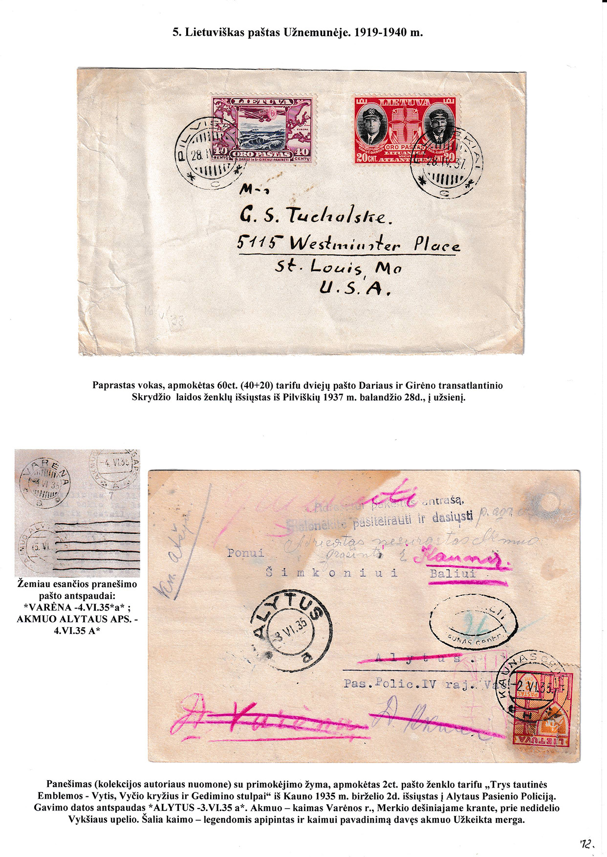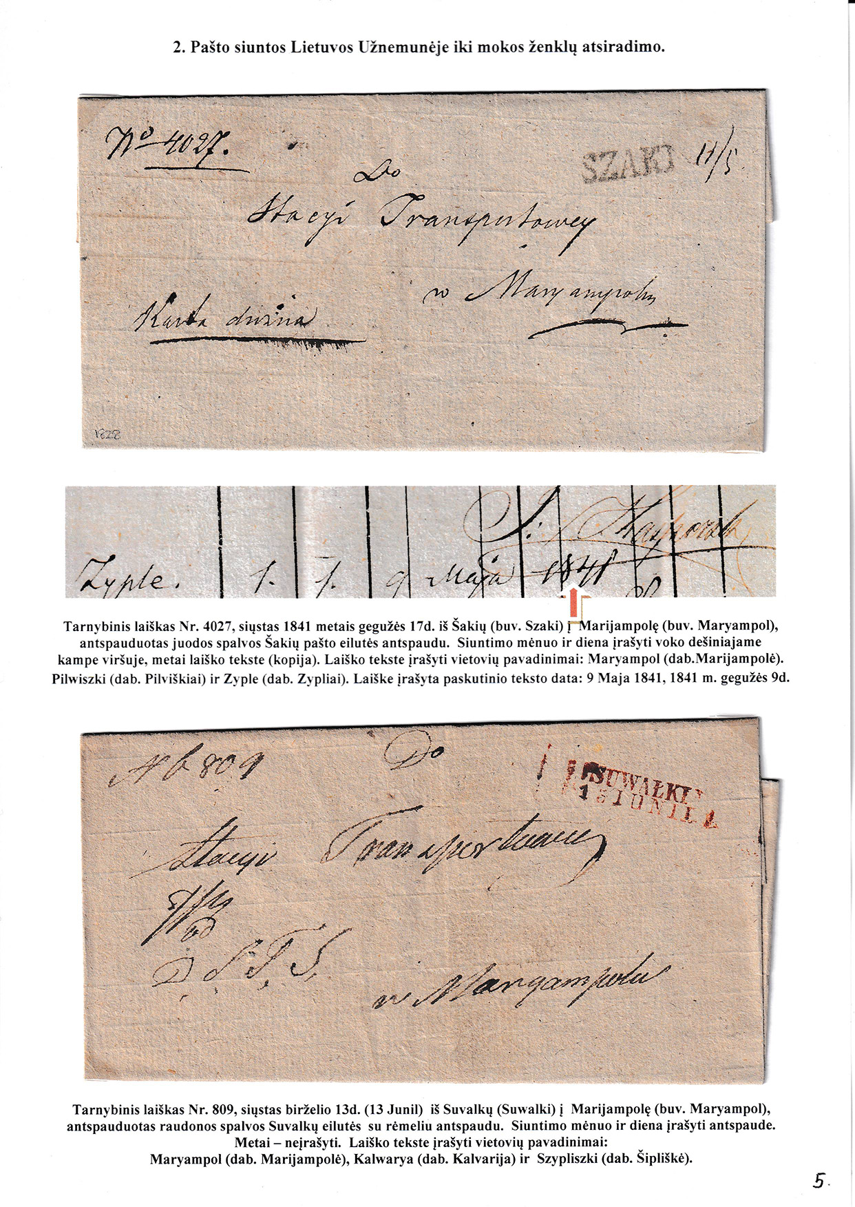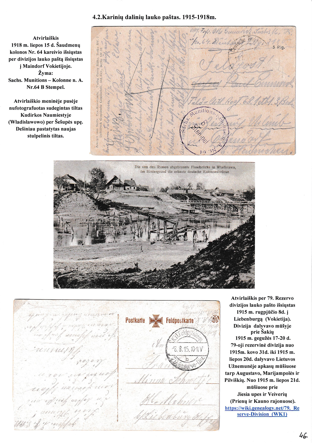 During different periods the following frontier post offices and post stations operated in the Užnemunė region in 1815-1866: Aleksotas (Alexota) from1815, Alytus (Olita) from 1841, Garliava (Godlewo) from1841, Kalvarija(Kalwarya) from 1815, Kapčiamiestis (Kopciov) from 1863, Lazdijai (Lozdzieje) from 1817, Marijampolė (Maryampol, Mariampol) from 1815, Vilkaviškis (Wilkowiszki) from 1815, Virbalis (Wierzbolow). Kudirkos Naujamiestis (Nowe Miasto, since December 11th, 1819, the name of the village is Wladyslawow) mail transportation and horse changing station since 1817. The philatelic exhibit of Užnemunė region includes postal item until 1858, postal history during the Governorate period after the introduction of postage stamps and Ober-Ost period. Also the period of the history of the Independent Lithuanian Post.
