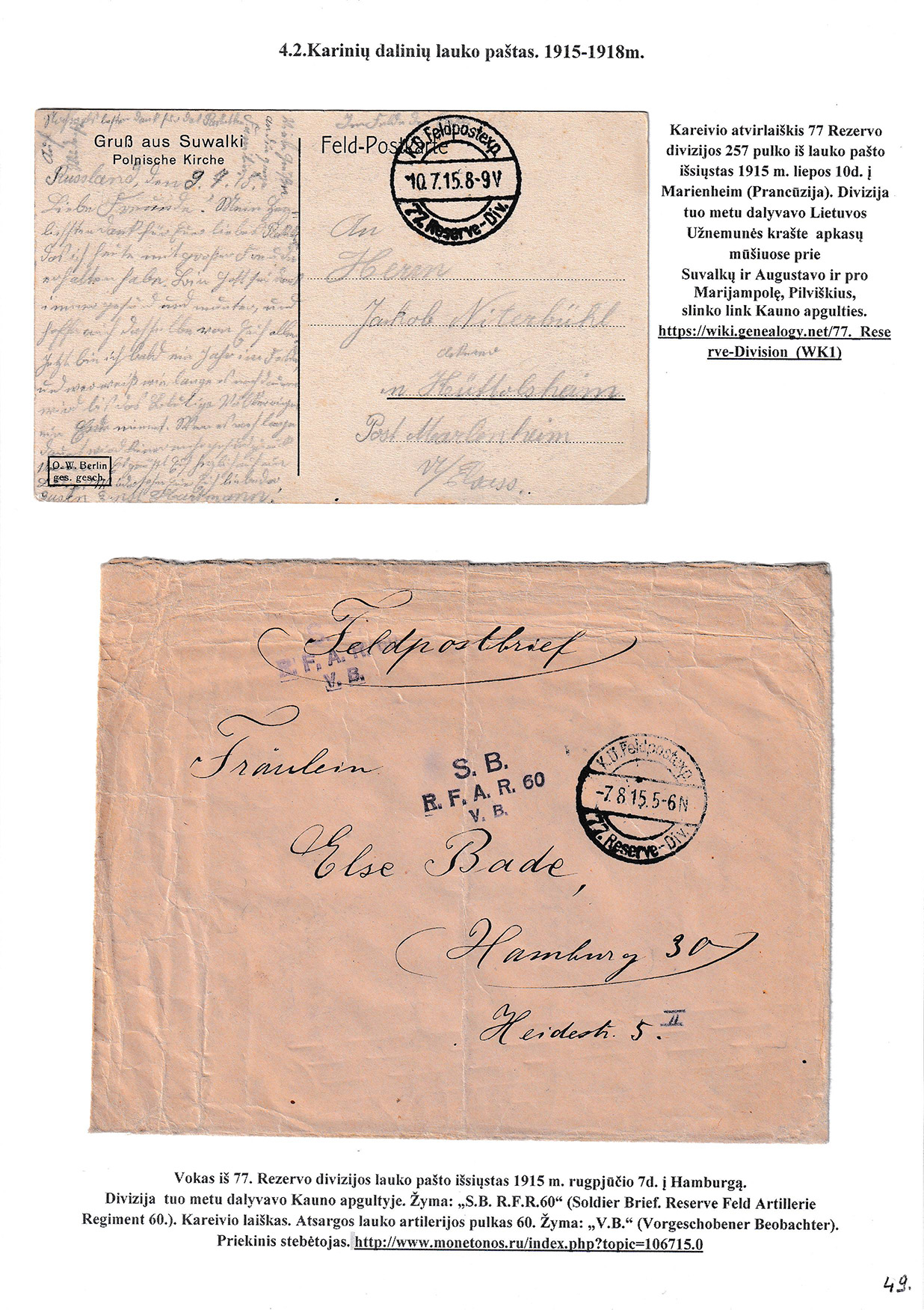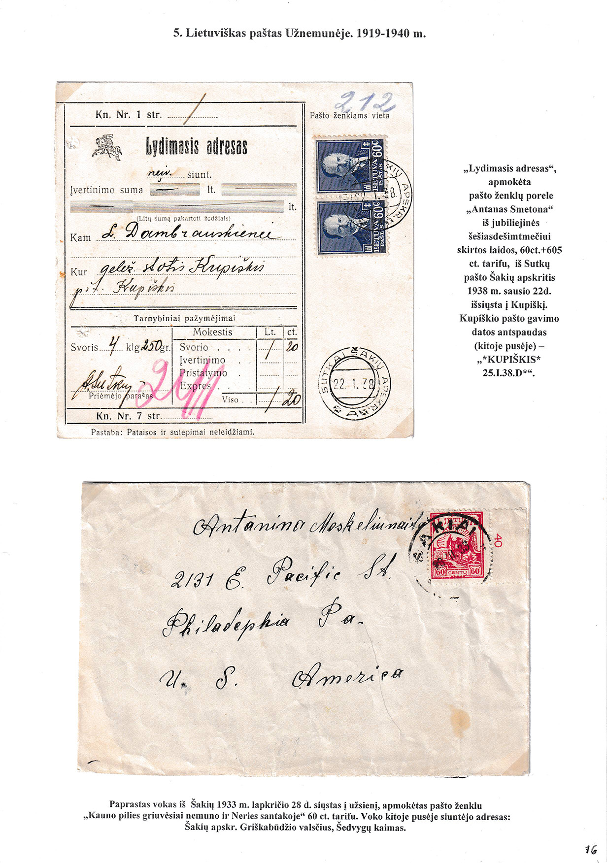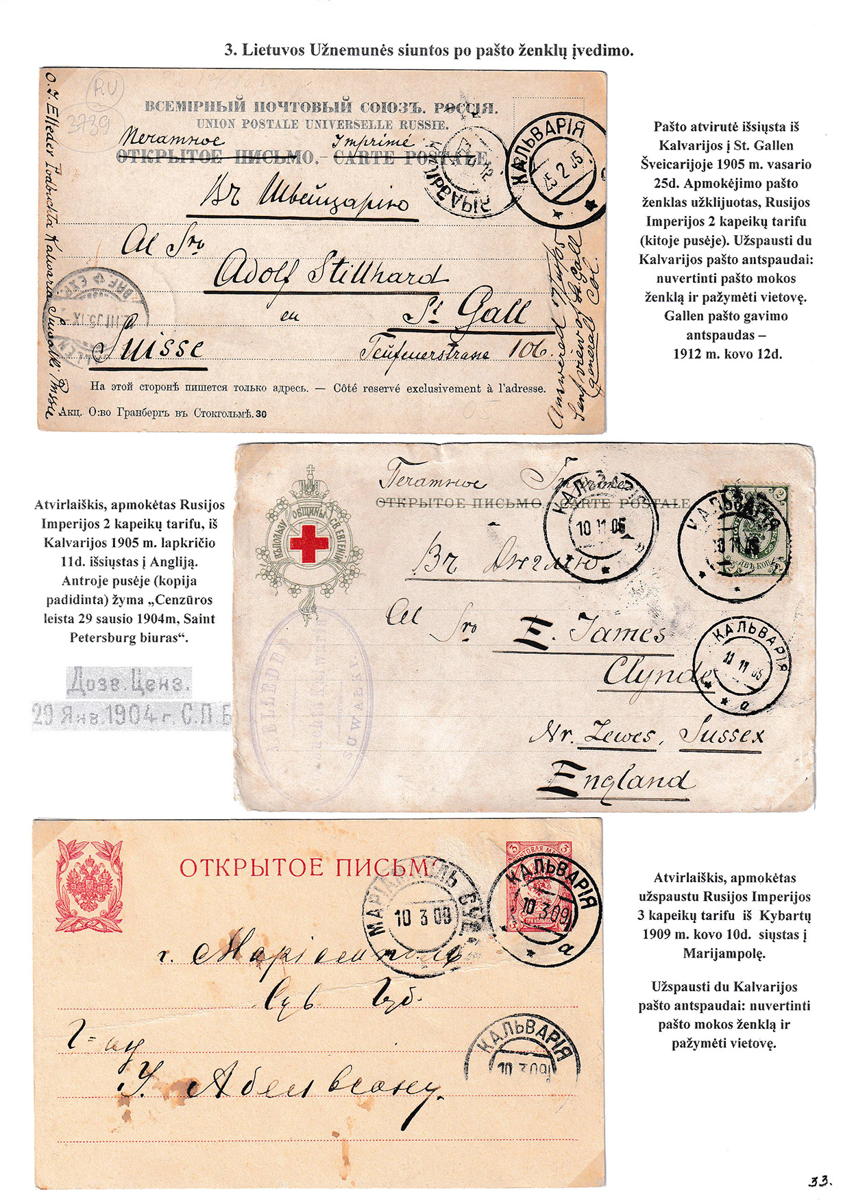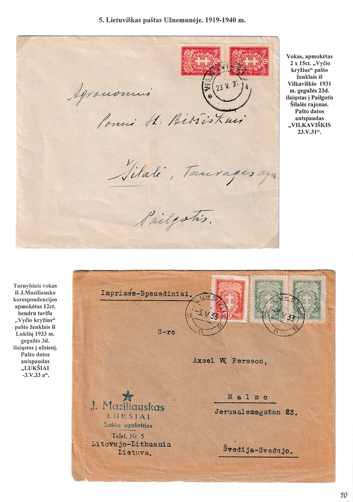 During different periods the following frontier post offices and post stations operated in the Užnemunė region in 1815-1866: Aleksotas (Alexota) from1815, Alytus (Olita) from 1841, Garliava (Godlewo) from1841, Kalvarija(Kalwarya) from 1815, Kapčiamiestis (Kopciov) from 1863, Lazdijai (Lozdzieje) from 1817, Marijampolė (Maryampol, Mariampol) from 1815, Vilkaviškis (Wilkowiszki) from 1815, Virbalis (Wierzbolow). Kudirkos Naujamiestis (Nowe Miasto, since December 11th, 1819, the name of the village is Wladyslawow) mail transportation and horse changing station since 1817. The philatelic exhibit of Užnemunė region includes postal item until 1858, postal history during the Governorate period after the introduction of postage stamps and Ober-Ost period. Also the period of the history of the Independent Lithuanian Post.