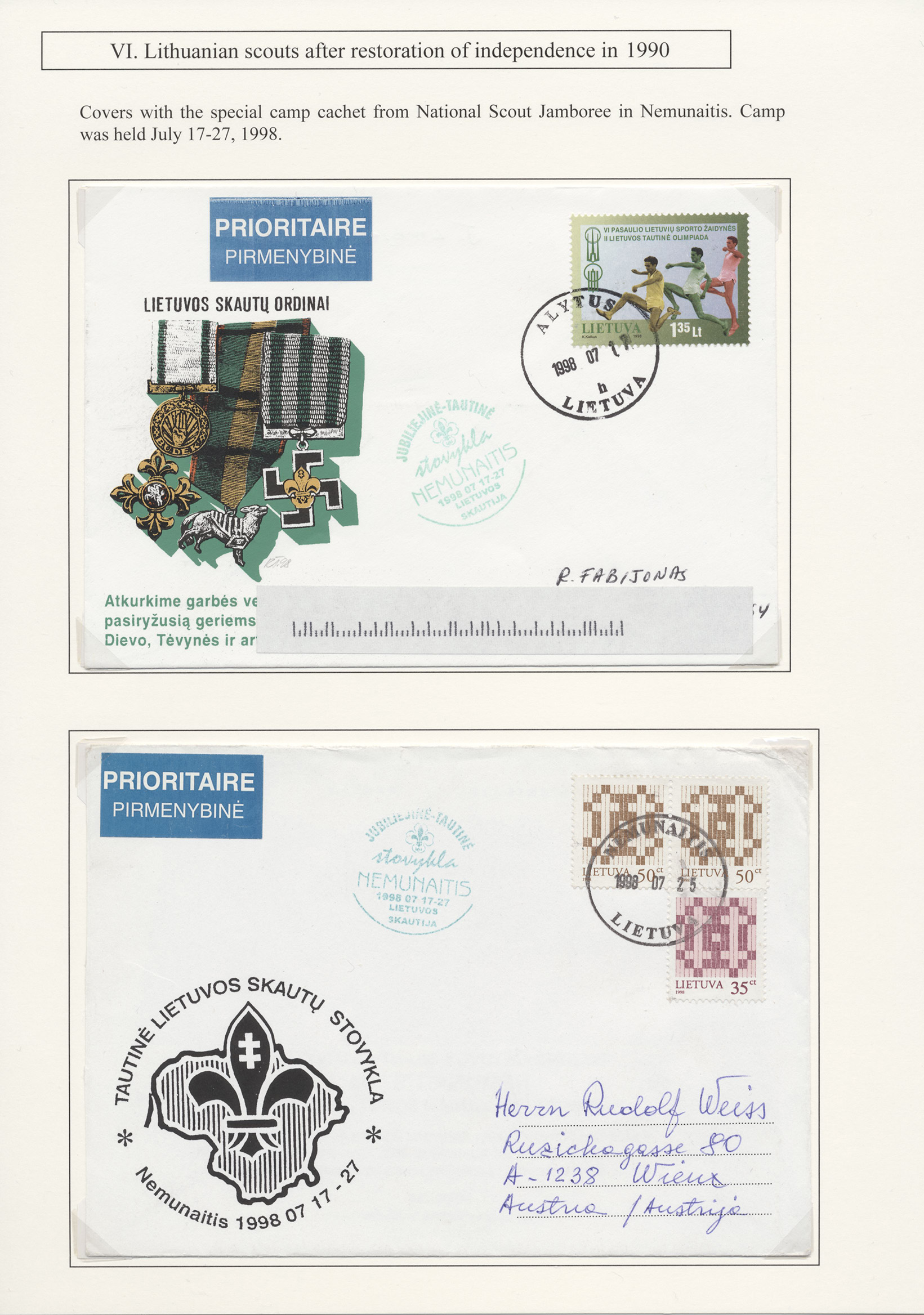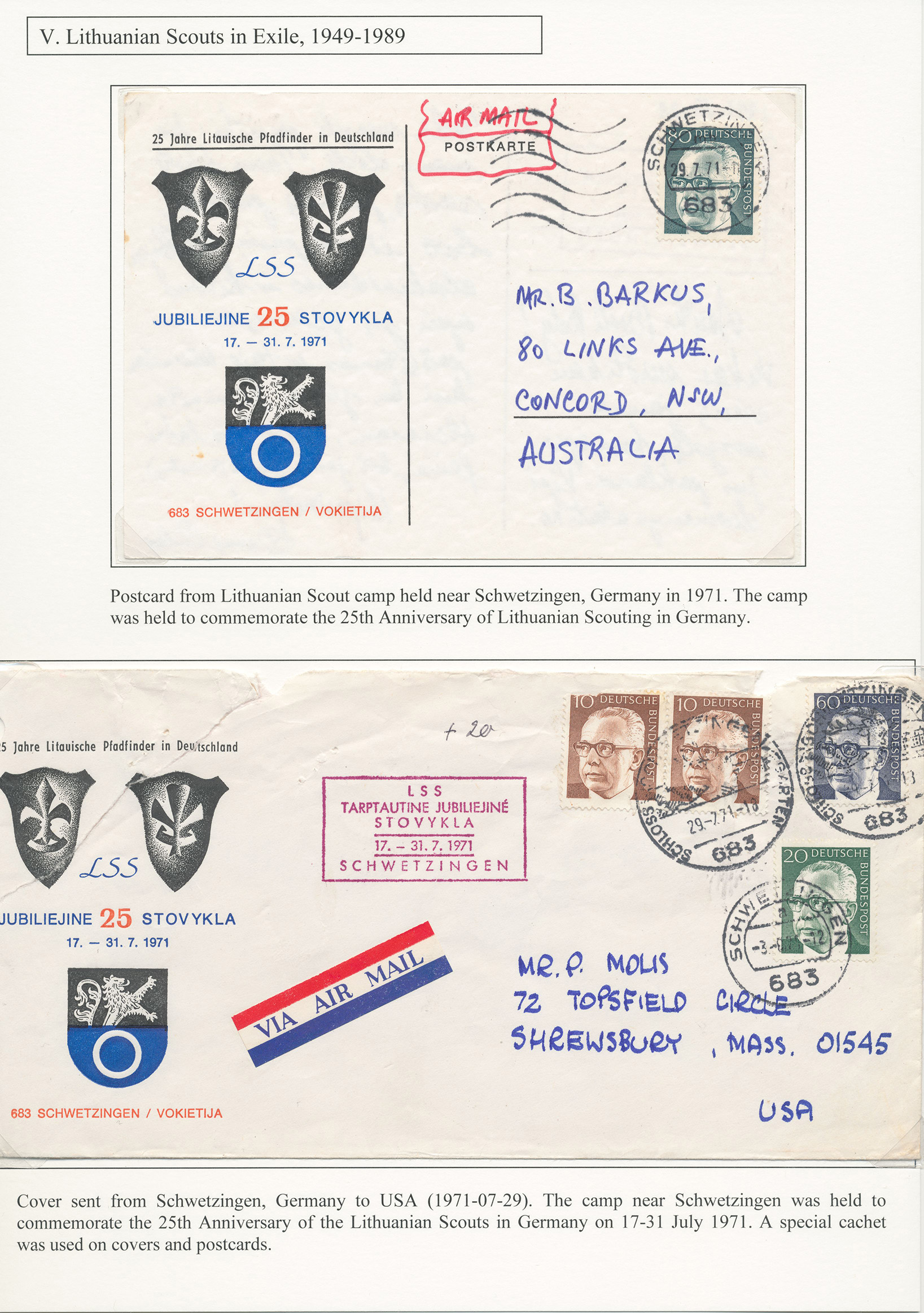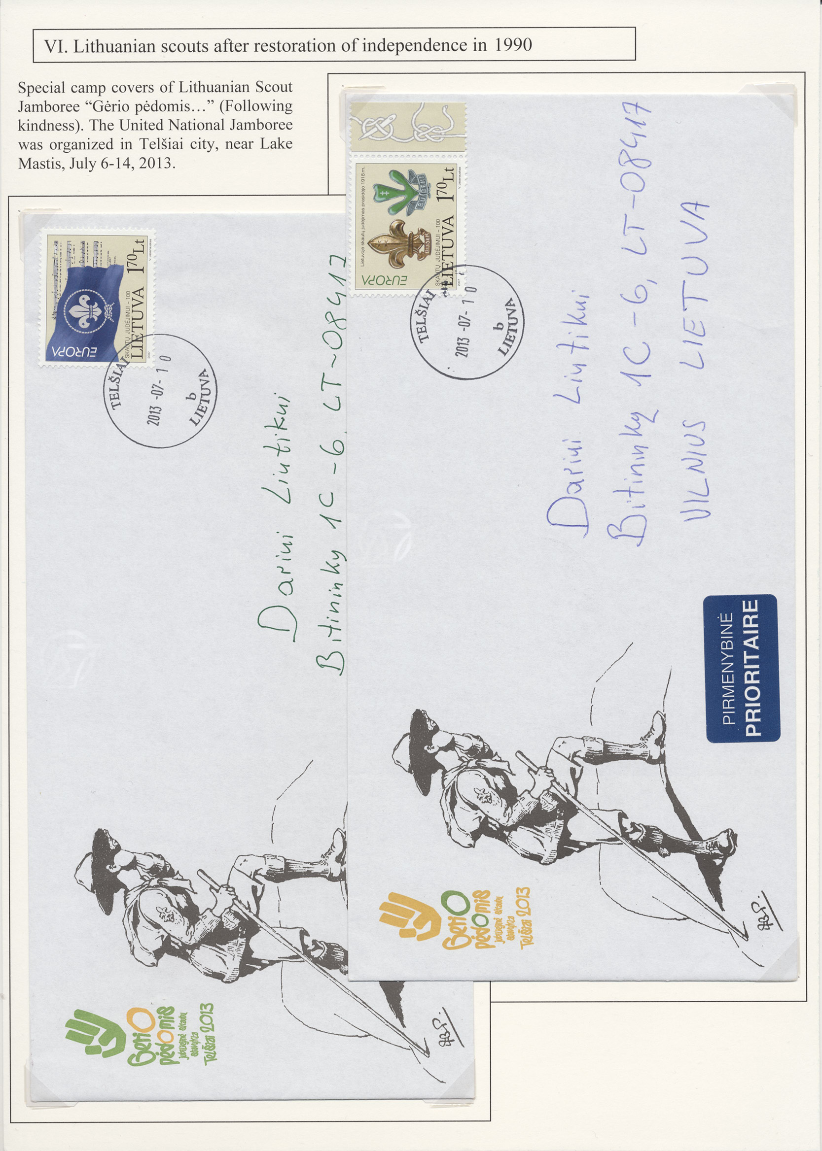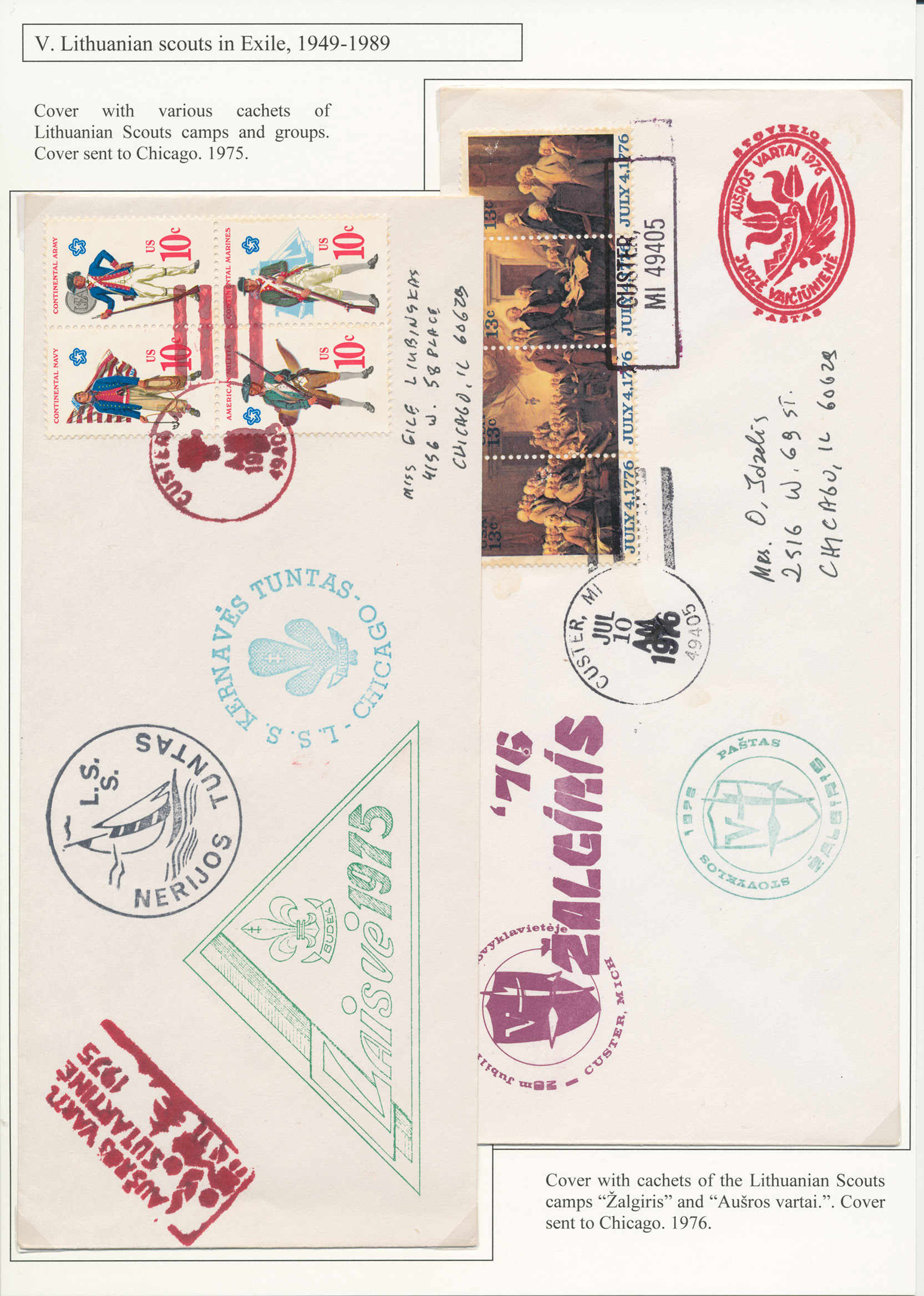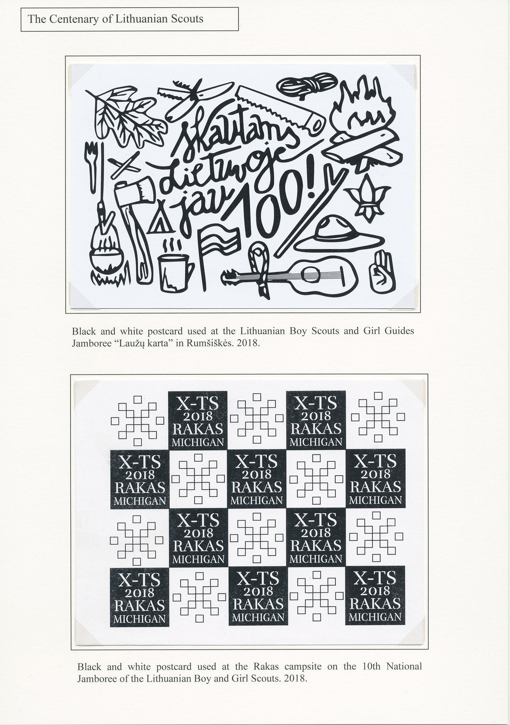 The exhibit includes postage stamps, souvenir sheets, covers, postmarks, cachets and cinderella stamps on the covers, postcards and other documents related to the Lithuanian Scout
