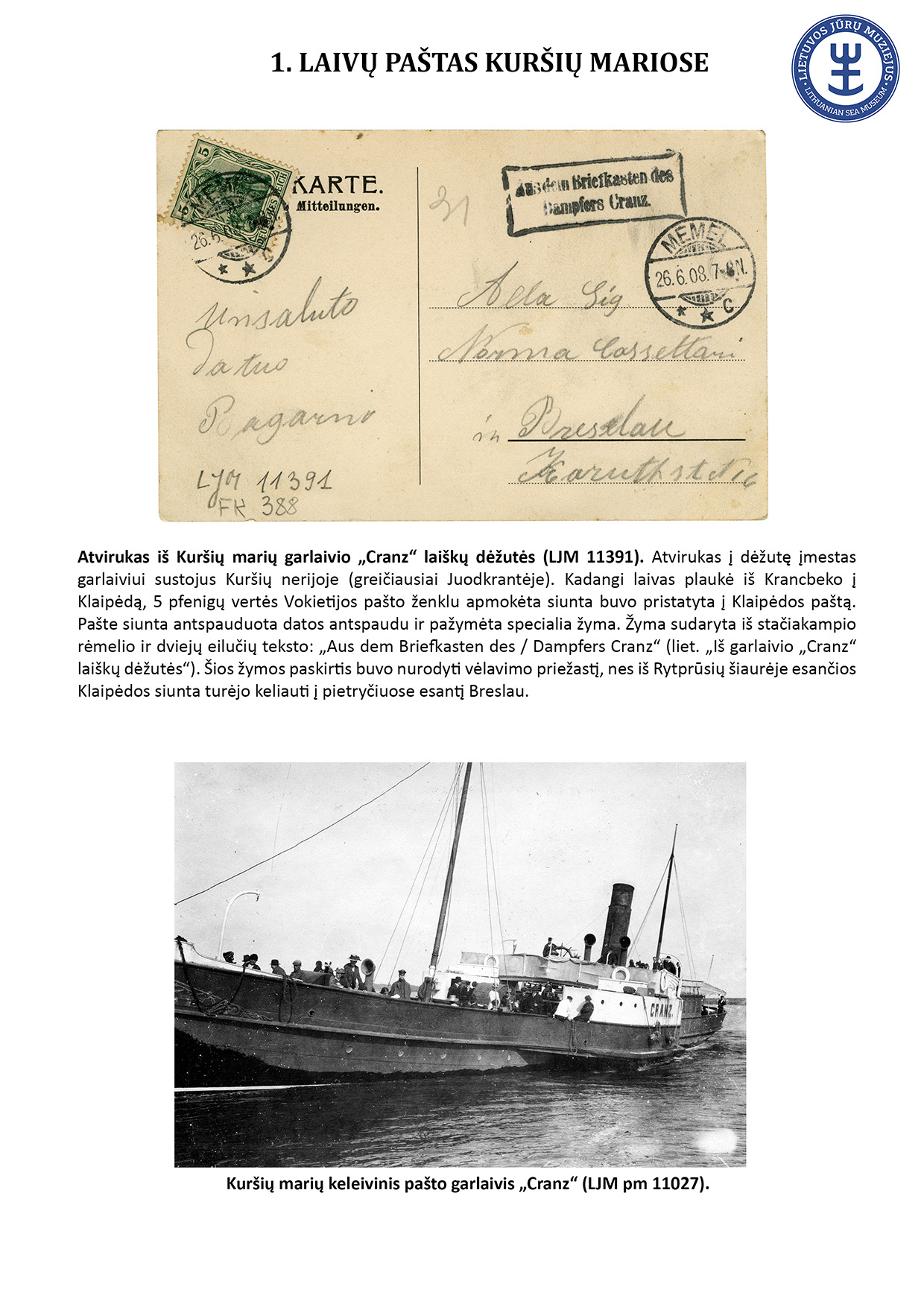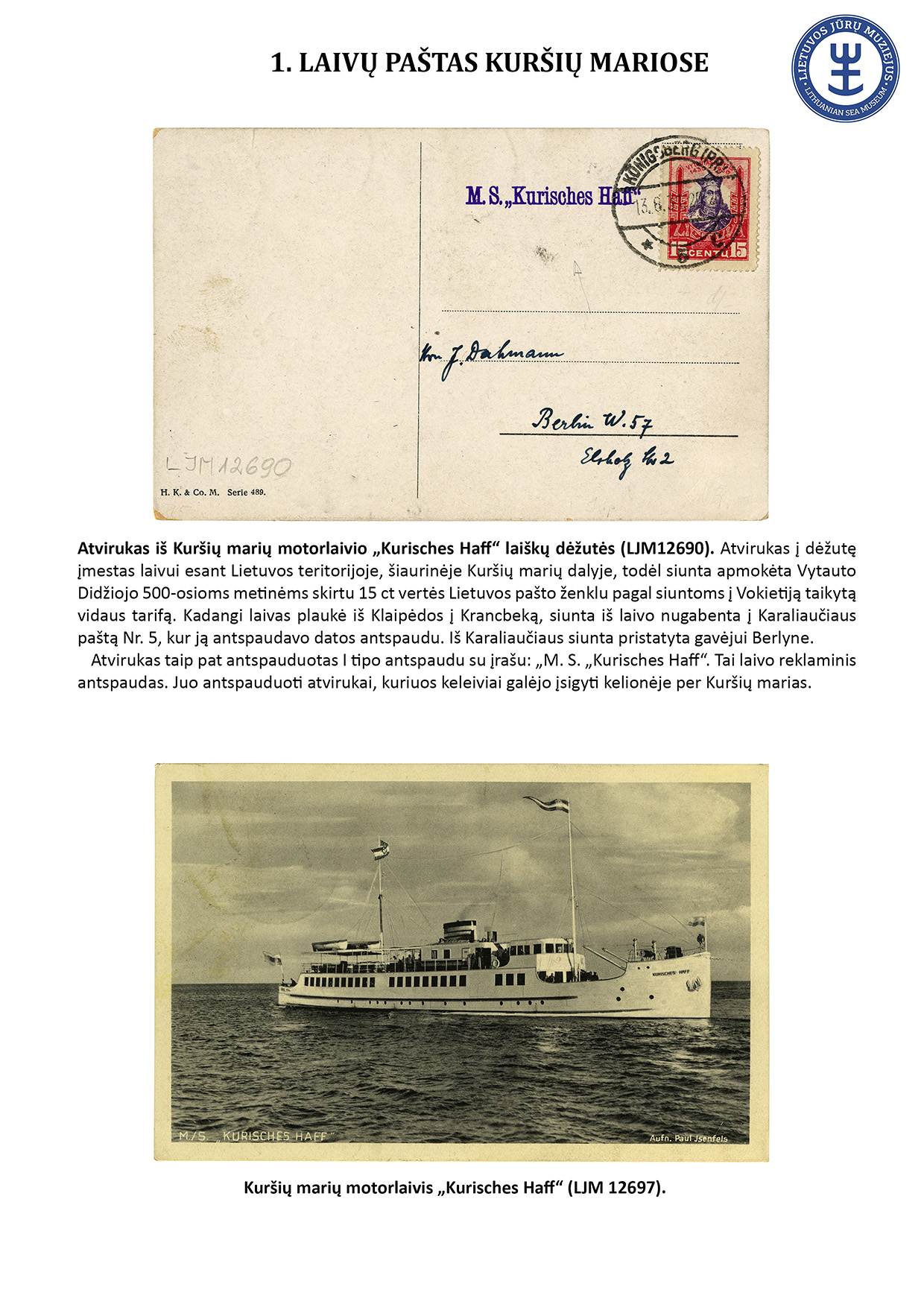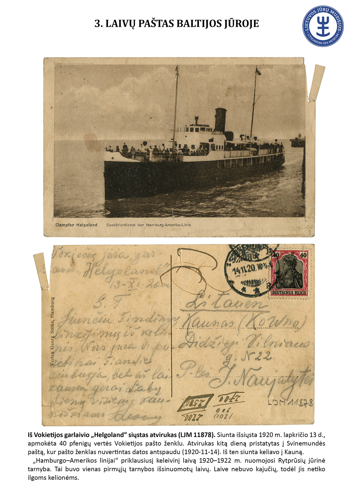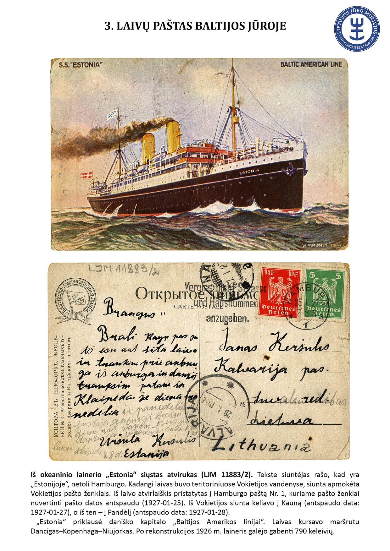 Since ancient times, letters have travelled not only by land but also by water. For geographical reasons, ship mail did not play an important role in Lithuania. However, mail sent from sea-going ships travelled to Lithuania, and steamships equipped with letterboxes sailed in the Curonian Lagoon. The Lithuanian Sea Museum has a small but interesting collection of postal history objects that travelled by ship. The exhibit presents 16 ship mail objects.