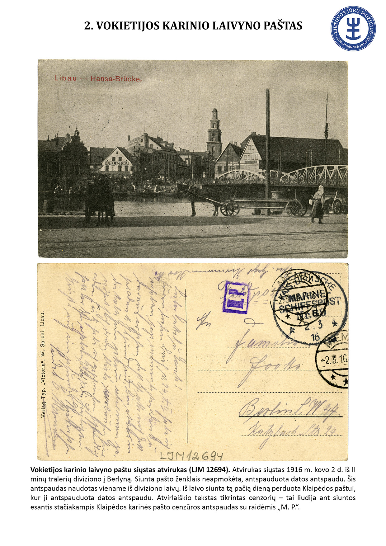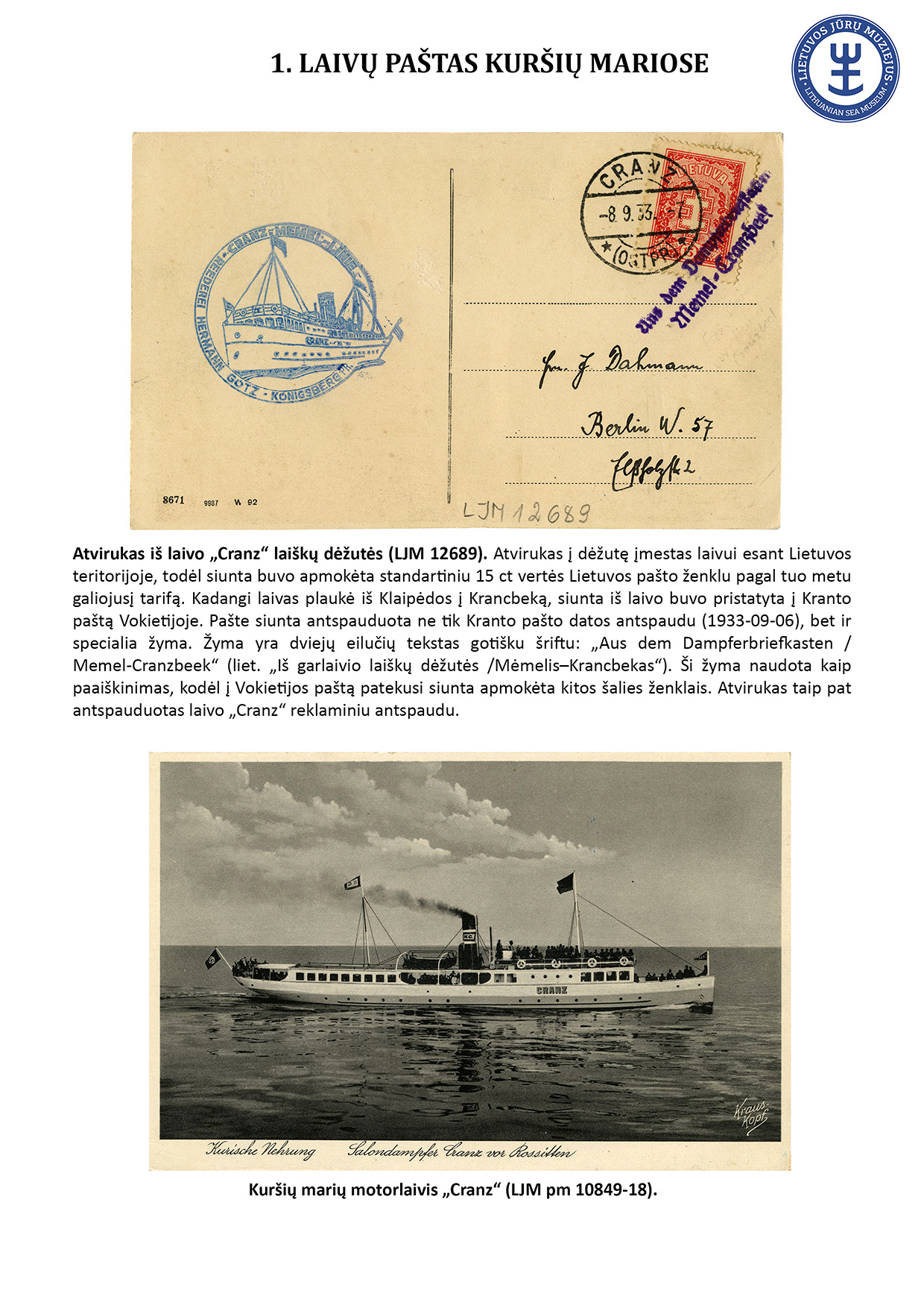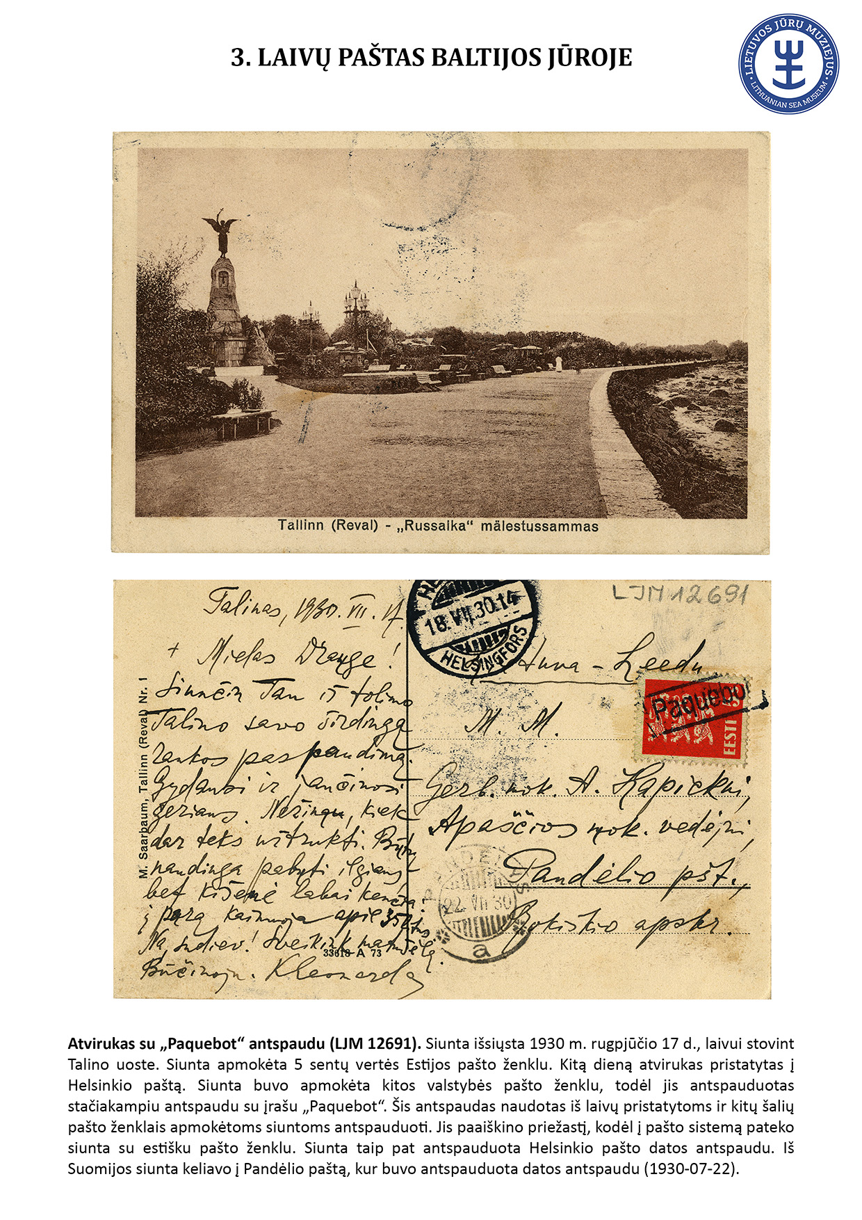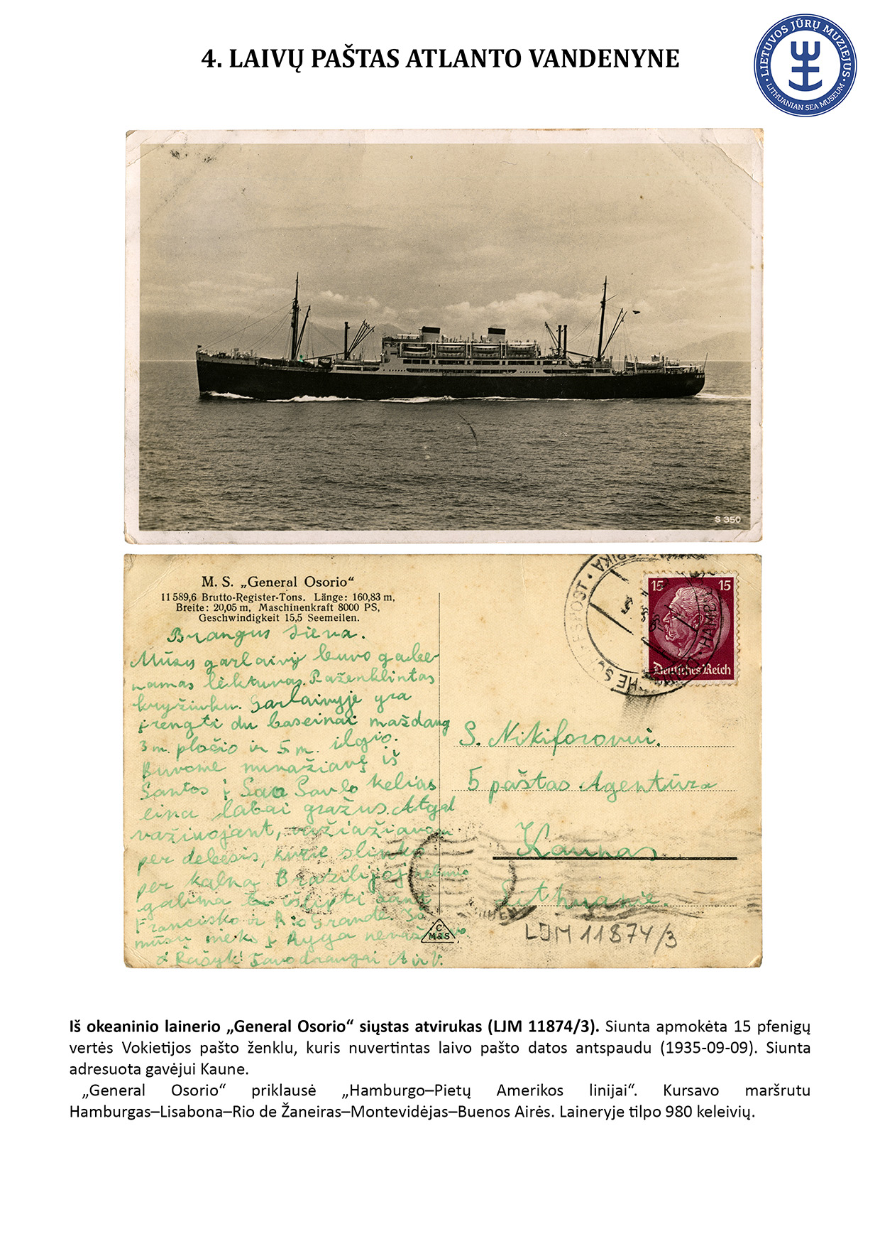 Since ancient times, letters have travelled not only by land but also by water. For geographical reasons, ship mail did not play an important role in Lithuania. However, mail sent from sea-going ships travelled to Lithuania, and steamships equipped with letterboxes sailed in the Curonian Lagoon. The Lithuanian Sea Museum has a small but interesting collection of postal history objects that travelled by ship. The exhibit presents 16 ship mail objects.