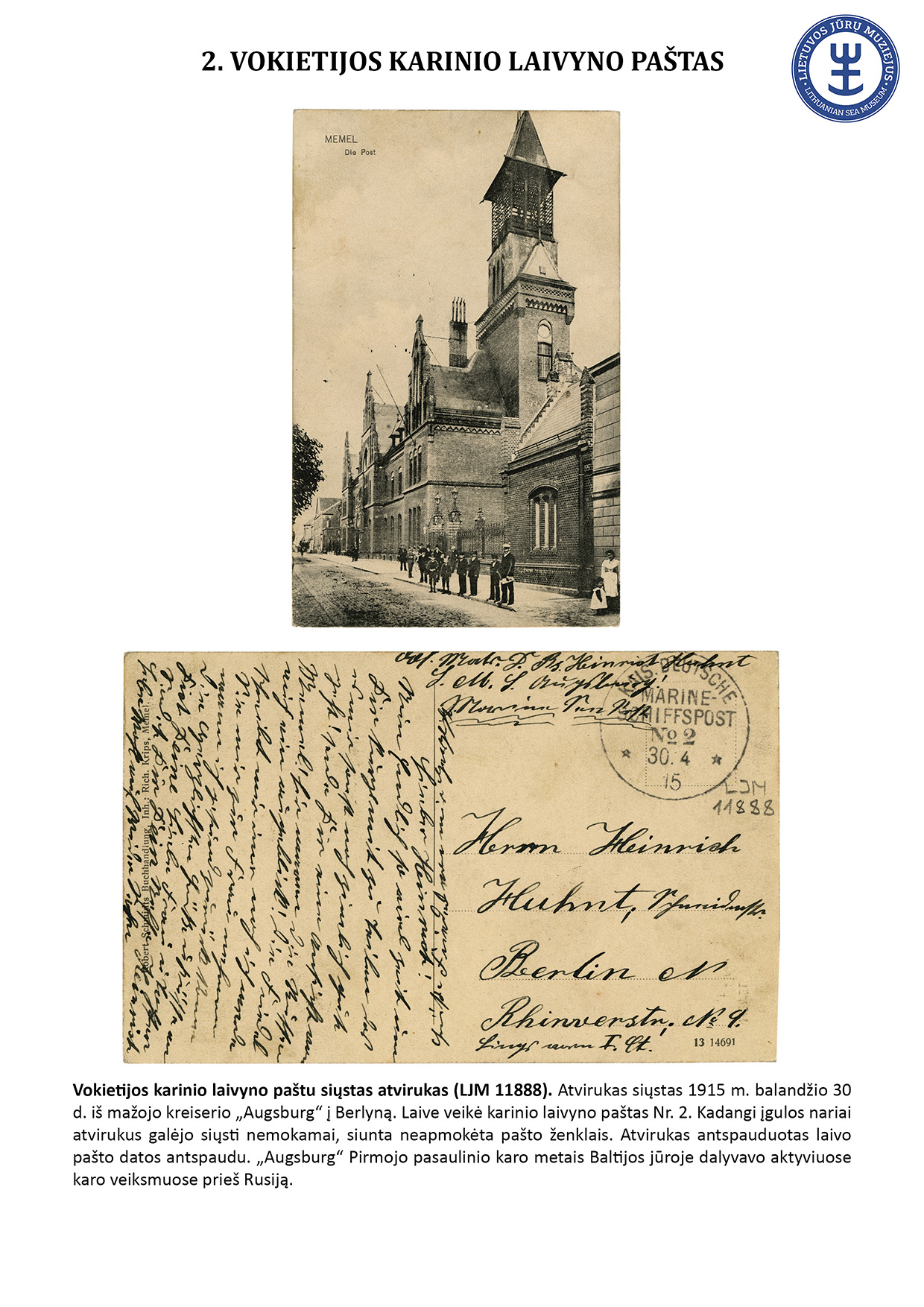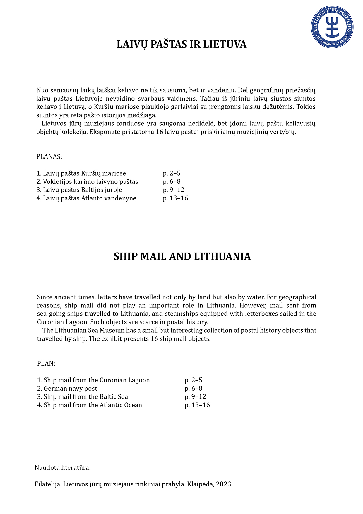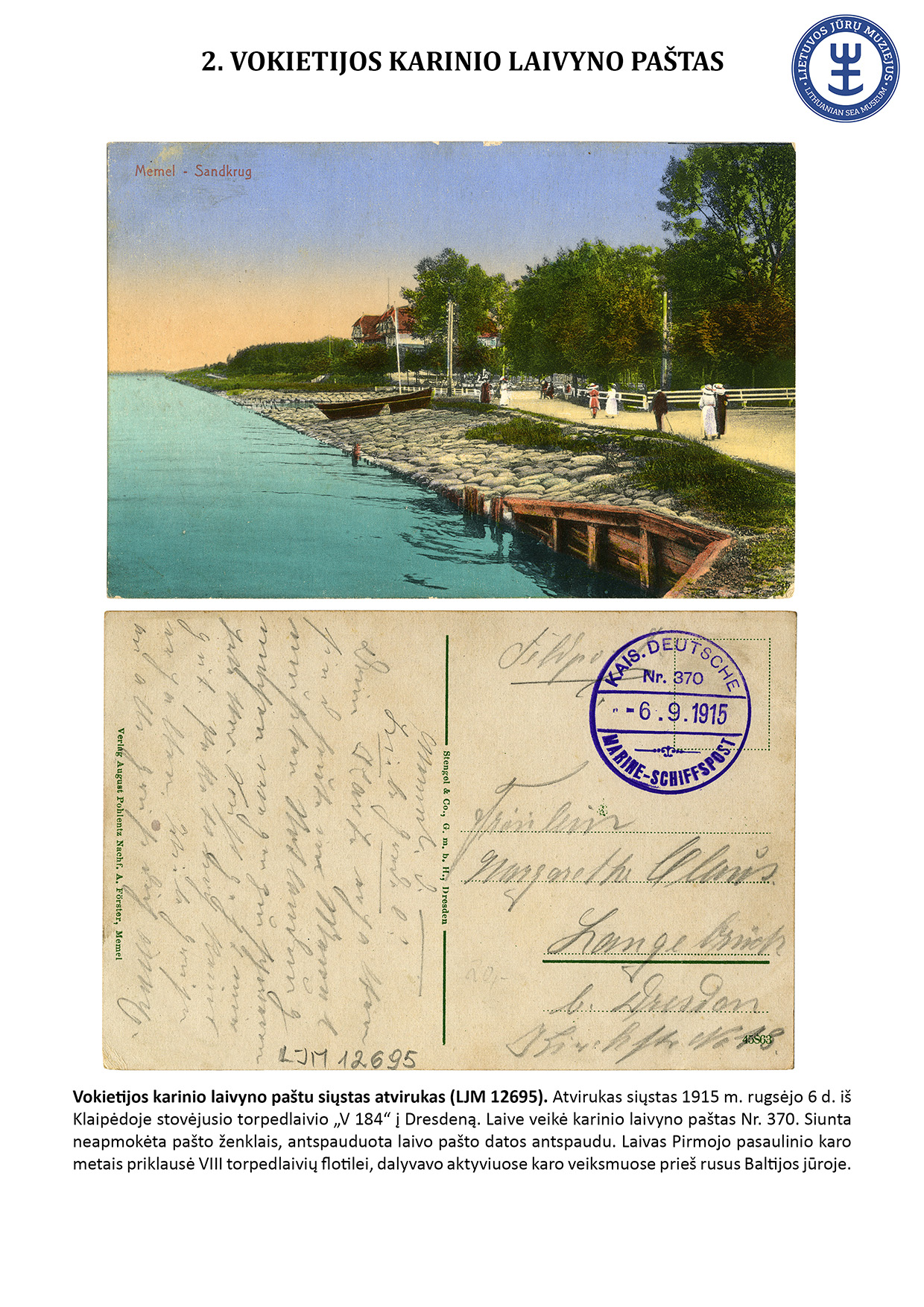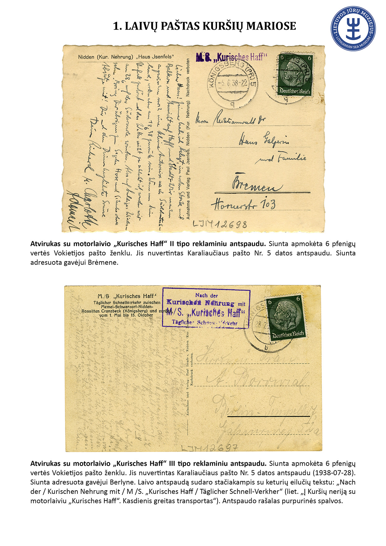 Since ancient times, letters have travelled not only by land but also by water. For geographical reasons, ship mail did not play an important role in Lithuania. However, mail sent from sea-going ships travelled to Lithuania, and steamships equipped with letterboxes sailed in the Curonian Lagoon. The Lithuanian Sea Museum has a small but interesting collection of postal history objects that travelled by ship. The exhibit presents 16 ship mail objects.