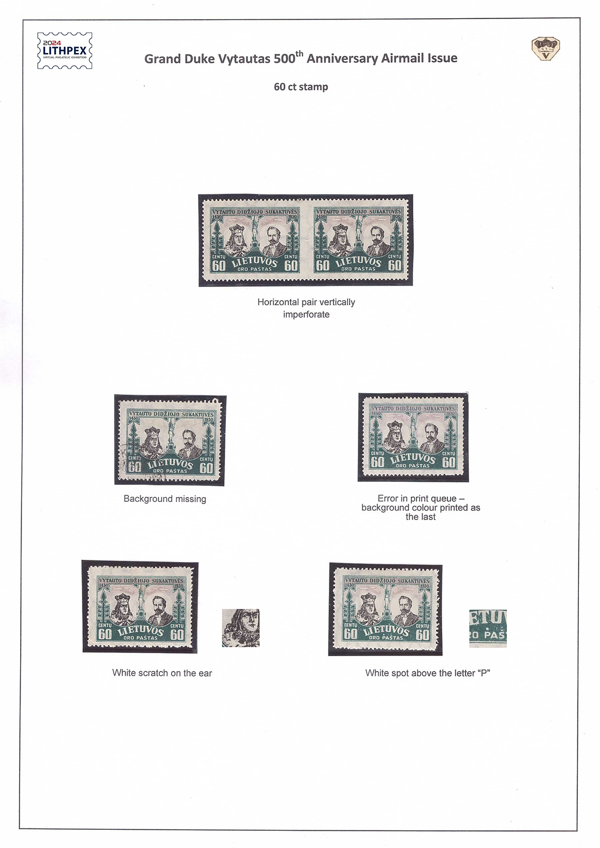 The stamps were printed by lithography at the “Spindulys” Printing House in Kaunas in sheets of 160 (8×5 and 5×8)×4 pieces. Artist – Adomas Varnas. Paper with watermarks Kv or Kh. Line perforation – 14¼.