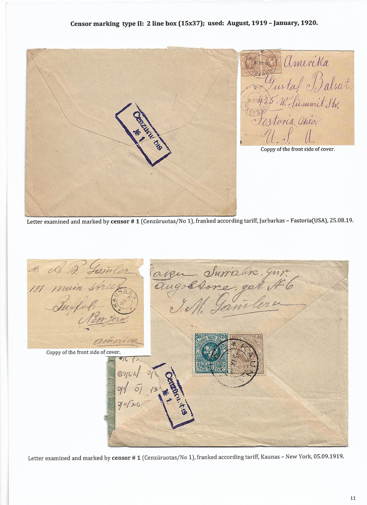 Description: On February 13, 1919 state of war was announced in Lithuania. After few weeks the War censorship regulations have been approved. There are 4 different types of censor cachets known and all of them are shown in the exhibit. In the catalog by V.Fugalevičius, P.O Cancels in Lithuania (1990) and its supplement (1997) there are 6 different cachets listed. This exhibit displays 13 different cachets.